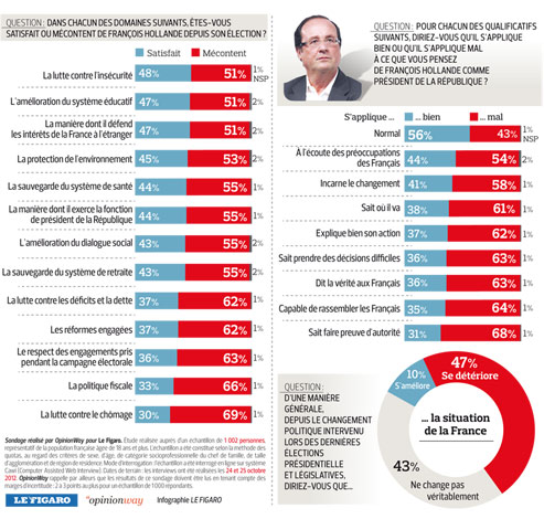 Ben dites-donc ! Question érosion de l’image, notre Soliveau-le-petit se pose un peu là. Moi, je regarde le calendo en bas à droite de l’image : 10% seulement -des imbéciles irrécupérables – voient les choses s’améliorer. 43% pensent que ça ne change pas : certes, les raisons de la cagade demeurent, mais tout de même : il suffit de considérer les ignobles extorsions fiscales auxquelles se livrent les Bercy-pirates pour comprendre que ce gouvernement d’amateurs fanatiques et irresponsable est en train de nous précipiter dans le gouffre. Pas besoin d’être Jérémie pour deviner le sort qui nous est promis : la banqueroute et les arrêtes de poisson. Donc il y a changement, c’est sûr, et en ce sens ce crétin de Soliveau tient ses promesses ! Ce que confirment les 47% de lucides qui voient bien que les choses se détériorent.