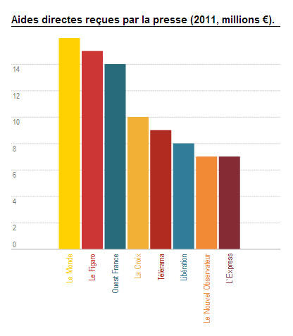 Vous trouverez un graphique plus complet chez owni.fr. Comme on le voit, ce ne sont pas des clopinettes qui sont distribuées aux journaleux : 16, 932 067 millions d’uros à l’Immonde. 15, 990 740 au Figaro. 8, 971 182 au torchon Libération. 7, 917 224 au Nouvel Obsédé. 6, 259 222 à l’organe communiste l’Houmma. De deux choses l’une : ou bien nous avons affaire à des entreprises de presse, et alors elles doivent se débrouiller avec leurs actionnaires et leurs ventes, comme toute entreprise honnête qui se respecte, ou bien c’est l’État qui les utilise au titre du Propaganda Staffel. La seconde hypothèse est la bonne. Nous avons-là un splendide symptôme du « mal français », de ce socialisme intrinsèque qui nous pourrit depuis des décennies.