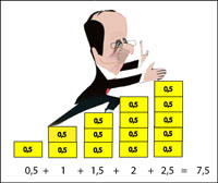 « Je veux dire que le même raisonnement s’applique chaque année, regardez ! » Je fis sur le papier un rapide schéma. « Voilà, Sire, quel est le montant de la dépense sur la durée de votre mandat ? » « De mon PREMIER mandat, corrigea-t-il, les gens m’aiment tellement qu’ils ne pourront plus se passer de moi ! Eh bien, pour répondre à ta question incongrue, cela fait… » Il se mit à compter les rectangles : « Quinze demi-briques, soit hum… je pose tout et ne retiens rien… 7 virgule 5 milliards ! » « Voilà, fis-je, vous êtes très fort ! » Le monarque était un tantinet déconfit, et j’entendis un « Oh ! Le cancre ! » venu de la pièce d’à-côté. « Oui, mais ensuite, ça ne coûtera plus que 2,5 milliards par an ! » conclut-il joyeusement. « Je l’admets, mais en attendant vous allez augmenter la dépense publique de 7,5 milliards en cinq ans. » « Oh bien ! Je ne pouvais tout de même pas dire ça aux électeurs ! Heureusement, presque personne ne vérifie mes chiffres. Et puis au diable l’avarice ! Les dépenses, c’est maintenant, les économies pour plus tard. C’est ça, le changement ! » rétorqua-t-il. « Allez ! Un dernier, commanda-t-il, l’heure du thé approche et Madame n’aime pas attendre ! »