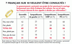 de leurs voeux un référendum, dont 55% de »sympathisants de gauche », même chez les front de gauchistes (65%). Évidemment, les gauchistes espèrent que le projet déviant serait accepté par le peuple sans renâcler, en cas de référendum. Il n’y a que les escrolos, gens complètement décadents et pervers, pour s’opposer en majorité à l’appel au peuple. C’est égal : comme le rappelle notre maxime en latin, « quod omnes tangent ad ombibus approbatur« . Ce qui touche tout le monde doit être approuvé par tout le monde. C’est un principe de démocratie : quiconque veut toucher à une loi fondamentale ne peut le faire que s’il a l’approbation du peuple. Ce n’est pas un parlement de rencontre qui peut avoir vocation de changer les données.