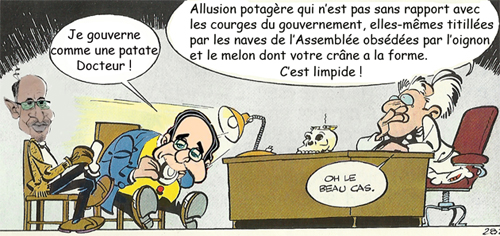 Tromondada contempla un instant le monarque avachi dans un fauteuil, puis : « État voisin de la catatonie… Semi-comateux… » « Oh pire ! Complètement comme ma queue ! » gémit le Roi. « Je vois, je vois… accès de coprolalie, syndrome de La Tourette… » murmura le psy, « dites-m’en davantage ! » Alors Soliveau, en un sanglot : « Beueueueueh ! On ne m’aime paââs ! » « Mmmm… Qui donc ne vous aime pas ? » « Les Français ! Soixante-huit pour cent disent que je ne vaux rien et que je gouverne comme une patate ! » gémit le monarque. « Je vois, métaphore potagère qui n’est pas sans rapport avec… Bon, étendez-vous sur le divan et relaxez-vous ! »