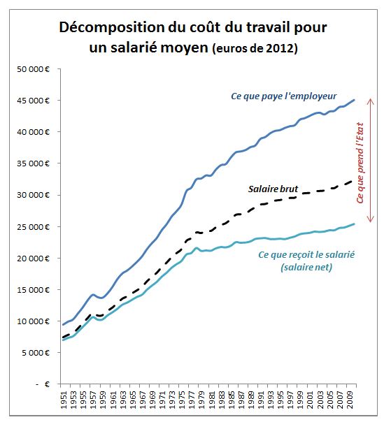 En clair : un tiers seulement de l’augmentation du coût total du travail est répercuté sur les salariés, tout le reste est avalé par Sa Bouffissure l’État. Que cela n’empêche pas d’être dans un abyssal déficit chronique. Vous remarquerez que la part spoliée aux salariés a considérablement augmenté, idem celle spoliée aux employeurs. Si l’État ne se mêlait que de qui le regarde, c’est-à-dire des ses rôles régaliens, s’il ne versait pas des prébendes à tous les paresseux, inutiles, subventionnés, le travailleur recevrait incontestablement une bien plus grande partie du fruit de son travail. Vous avez dit : « théorie de la plus-value », monsieur Marx ? Eh bien ! Comme dans tout régime socialiste, la plus-value est largement confisquée par l’État. Et encore, les courbes s’arrêtent à 2010 ! Attendez que les chiffres tiennent compte de la gestion socialiste du travail, et la chute des feuilles d’impôts à l’automne, et vous verrez !