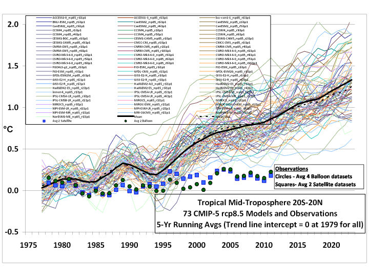 Ce graphique est facile à lire. Les résultats des 73 modèles sont indiqués par des courbes dont les couleurs font référence à la liste des modèles, tandis que les cercles sont les résultats des mesures par ballons sondes et les carrés ceux des satellites. Le moins que l’on puisse dire est que les mesures réelles ne collent pas du tout avec les délires informatiques des adorateurs de Mann et de sa crosse de hockey. N’empêche : les abrutis du gouvernement font « comme si » et travaillent sur… une nouvelle mouture de l’ignoble et injustifiable « taxe-carbone ».