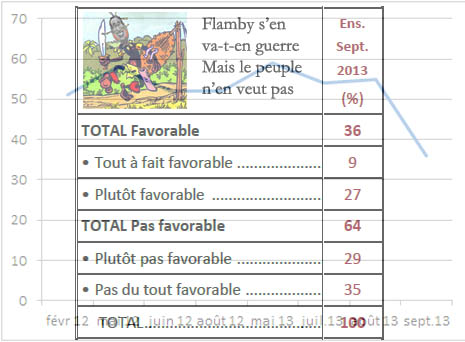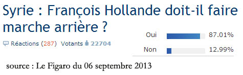 Raymond notait hier que la politique se jugeait dans l’assiette à la pompe à essence et chez le percepteur : c’est vrai. Mais on remplit encore l’assiette -même avec de plus en plus de difficultés- le réservoir -bientôt le litre de gazole sera au prix du n°5 de Chanel-, et l’on crache encore au bassinet faute de déclencher une salutaire grève de l’impôt. Là est le hic ! Ces Français avachis, assommés depuis 1940, ont perdu toute velléité de révolte. Cependant, ils sont majoritairement contre une expédition stupide et criminelle, voir les sondages. Alors qu’ils se réveillent et foutent en l’air ce pouvoir de clowns criminels !