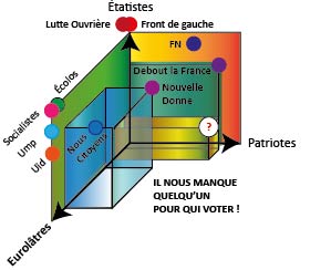 C’est facile à lire, je pense. Par exemple, les totalitaires étatistes comme Lutte Ouvrière et le Front de Gauche sont non-eurolâtres et non-patriotes mais totalement étatistes. Les socio-fâchos et leurs complices verdâtres sont non-patriotes, mais totalement étatistes et eurolâtres, leur différence avec l’UMP et l’UID n’étant qu’une question de degré dans l’étatisme. Le FN est non-eurolâtre, plutôt patriote mais très nettement étatiste. Nous avons placé selon les critères Nous Citoyens et Nouvelle Donne. Debout La France est nettement a minima européen –partisan d’une Europe restreinte à 6 membres – nettement patriote mais fortement étatiste.