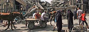Cette photo n’est pas la pire de la propagande pro-Hamas, et c’est pour cela que je l’ai choisie. En arrière-plan, des bâtiments dévastés, superstructures effondrées, toitures coulant dans le vide, gravas. Au second plan, une voiture tirée par un cheval, portant quatre personnages le dos voûté, l’un d’eux bras ballants et jambes croisées. Et au premier plan, des femmes revêtues de hidjabs, des adolescents ou des enfants. Je ne sais pas si cette photo est truquée (la propagande en regorge), mais son choix est clair : elle illustre le titre de l’article. Il n’y a pas de refuge : Tsahal a tout dévasté.