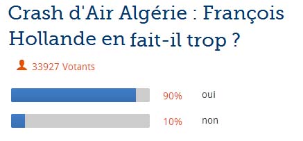On le disait : les opérations de récupération du crash de l’Air-Algérie par Pleurnichard 1er et sa clique battent son plein et commencent à casser les pompons à pas mal de gens, si l’on se réfère à la consultation en ligne des lecteurs du Figaro (voir ci-dessous)