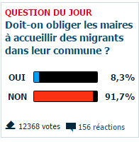 Réfléchissez bien à ce sondage en ligne paru aujourd’hui dans Le Parisien : sur 12392 votants, 91,7% répondent « NON » à la question : doit-on obliger les maires à accueillir les migrants dans leur commune ?». Méfiez-vous, les choses pourraient mal tourner pour vous autres, gens de sac et de corde, amis de l’ennemi. Vous êtes allés trop loin, beaucoup trop loin, maintenant nous allons vous stopper.