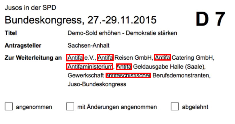 Le site Allemand journalistenwatch, nous dit Novopress, a pris les « Jusos » du SPD allemand (officine semblable aux jeunesses socialistes en France) la main dans le sac. Les Jusos financent des actions « antifas » en s’adressant à ces officines fascistes très bien organisées : Antifa Reisen (déplacements en bus, payés), Antifa Gmbh (publication) et Antifa Catering (nourriture : ses sandwichs pour les nazillons « antifas !). Le document ci-dessous, dans le bilan financier présenté au congrès fédéral, indique nettement qu’il s’agit du montant des frais engagés pour organiser des manifestations (pour affermir la démocratie !!!) et des pétitions, et que les bénéficiaires sont les officines fascistes « antifas ». Les « antifas » sont une pègre industrielle, en quelque sorte.