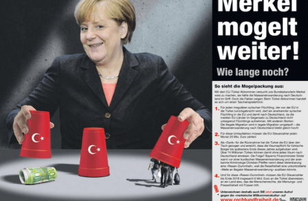 Voilà un appel parfaitement légitime. Voilà une action recevable dans le cadre d’un État de droit où les lois fondamentales garantissent la liberté d’opinion et d’expression. Mais voilà précisément ce qui embarrasse la caste politique et les médias de propagande. Ces vauriens-là craignent deux choses : le peuple qui s’oppose à eux -et les succès récents de l’AfD ainsi que les manifestations de Pegida montrent que cette opposition peut mettre la caste en péril – et l’Ottoman qui menace. La vieille Merkel n’a-t-elle pas récemment fait droit à une récrimination de l’Erdogan voulant poursuivre un satiriste ayant commis un crime de lèse-babouche en appelant le tyran d’Ankara « sodomiseur de chèvres » ? Donc à l’exception notable de Hannoversche Zeitung, les journaux de propagande allemands ont refusé d’imprimer l’appel à la pétition. C’est, finalement, un grand journal Suisse, Neue Zürcher Zeitung, qui a accepté de publier.