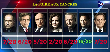 Sans trop de surprise, chaque classe ayant un idiot du village, c’est NKM qui a la palme de la nullité avec 2/20. Normal : à la chasse aux bécasses, elle se blottit dans le même buisson que sa rivale socialiste Hidalgo. Ensuite, vient le dernier des cancres, Ali Juppé, avec 5/20. Pas de surprise non plus : c’est le chouchou des socialistes (« le meilleur d’entre nous » pourrait-on dire rue de Solférino en parodiant Chirac), qui s’apprêtent à saboter cette ridicule primaire en votant pour lui. Ali, c’est le moins disant, très proche de la gauche, autant dire le candidat d’une gauche qui a bien compris que c’est fichu pour elle à cette élection. Complice des salafistes, Ali Juppé aura aussi les voix musulmanes. Un trio de Pieds Nickelés -Copé, Fillon, Sarkozy- plafonne à 7/20. Bah ! C’est de la même veine qu’Ali : quand ils ne sont pas franchement islamophiles, ils flirtent avec les musulmans, ils sont européistes atlantistes et se moquent de la souveraineté nationale comme de leur première chaussette. Avec eux, rien à espérer. Le seul qui tire son épingle du jeu, le premier de la classe, est JF Poisson. Mais il est trop près de la vraie Droite pour recevoir l’appui des médias de propagande, donc, à moins d’une intervention de la Providence, il ne sera pas élu candidat. Dommage.