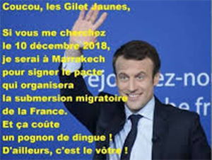 Les taxes, l’invasion, le mondialisme : là sont les raisins de la colère. Et ses raisons. Pendant que des GJ se feront massacrer, le béjaune élyséen ira trahir notre Pays. Tirons-en toutes les conséquences pour des actions futures. Car nous ne sommes pas au bout de nos peines !
