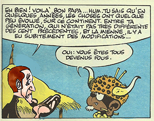 J’ai demandé à notre photoshoppeur de bricoler une image extraite d’un album du regretté Greg, « Achille Talon et le Coquin de Sort » en faisant en sorte que la tête du président Molloptiga soit remplacée par celle du « président » MacNéron. Comme vous le voyez, l’énergumène, progressiste en diable, essaie de justifier son action : les choses ont « quelque peu évolué » et « il y a eu subitement des modifications ». Bon-Papa Kutoufu, le sorcier, pardon : l’expert en parapsychologie appliquée, lui répond : « Oui : vous êtes tous devenus fous. » Saintes paroles d’un Ancien qui sait, en même temps que les pieds sur la terre, raison garder. Le monde Occidental est devenu fou, fou à lier. Tout le monde Occidental ? Non : il reste quelques villages résistant encore et toujours à l’invasion de mœurs d’aliénés venue des campus et des « démocrates » d’Outre-Atlantique et répandues viralement parmi ces imbéciles de bobos.