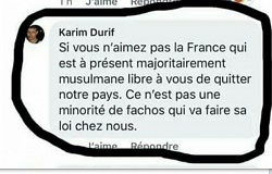 Un site (je ne sais plus lequel) a publié une jacassinade (2) reproduite ci-contre. Le fellagha nommé Karim Durif s’y croit déjà : la France serait désormais le pays des fellouzes, les peuplades qui y vivent seraient en majorité de religion chamelière, et les souchiens « fachos » n’ont qu’à la quitter s’ils ne s’y plaisent pas. Trou du cul, va ! Sale petite vermine islamique ! Dois-je te rappeler, crétin de l’Atlas ou du Rif, que la France est encore peuplée de citoyens de race Blanche, de culture héritée de l’Antiquité gréco-latine et du christianisme, même s’il y a une majorité d’athées ? Nous avons là un exemple de l’arrogance de ces minorités musulmanes dont l’objectif est de nous éliminer par une fécondité de rongeurs. Écoute-moi bien, Karim-de-mes-deux, nous sommes de plus en plus nombreux à avoir ras le bol de vos saloperies et décidés à vous mettre sur la tronche. Vous n’avez pas votre place sur la terre de nos ancêtres et nous vous flanquerons à la porte. Mégalo-Le-Suprême, ton protecteur et toute sa bande de gibiers de potence n’y pourront rien.