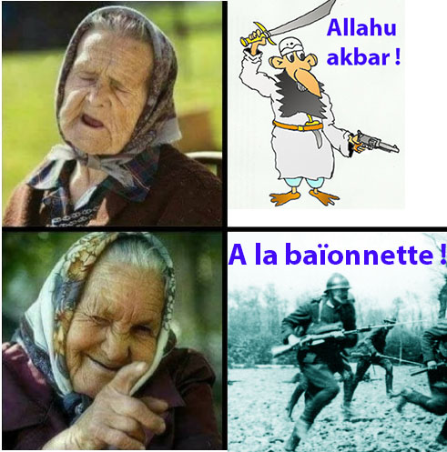3- Le terroriste ordinaire braillant « allahu akbar » (pas bon ! ) versus la réponse adéquate des héros courageux : « À la baïonnette ! » (beaucoup, beaucoup mieux ! ).