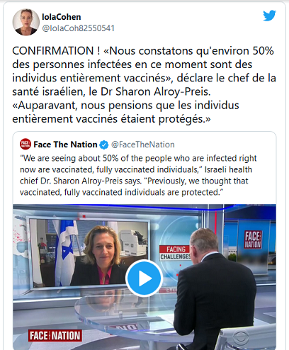 mutants. Le Pr Raoult, disant qu’en visant la seule protéine « spike » on essayait d’atteindre un objectif trop réduit, donc qu’on risquait de le rater, avait parfaitement raison. Le Dr Sharon Alroy-Preis, responsable israélien de la santé, a déclaré : «Nous constatons qu’environ 50% des personnes infectées en ce moment sont des individus entièrement vaccinés.»