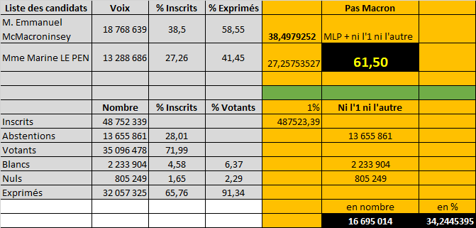 Le quorum étant atteint (50% = 24 376 170, votants = 35 096 478) et l’énergumène ayant obtenu la majorité qualifiée, sur le plan légal, à première vue, rien à dire. Mais le cumul des voix de MLP avec les abstentions + les votes blancs + les bulletins nuls, fait qu’en réalité 61,5% des citoyens n’ont PAS voté pour l’homme de Washington-Davos-Bruxelles.