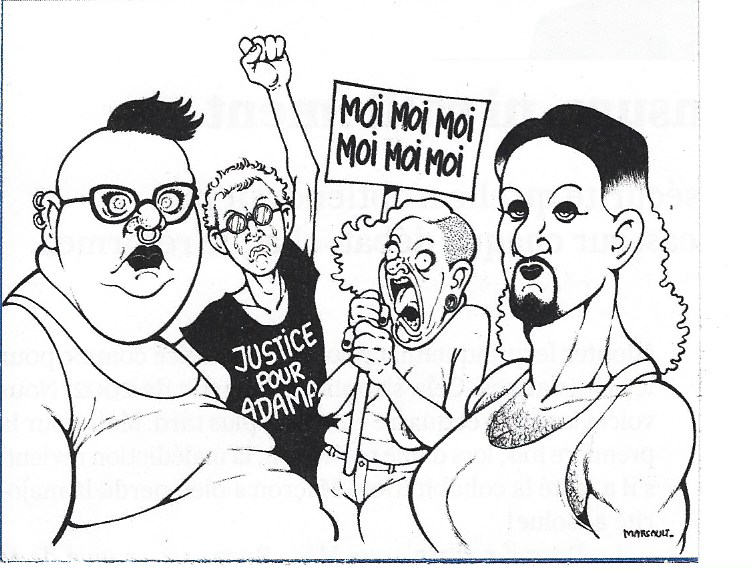 - Le phasme, personnage à épaules de serpent, acné, cheveux en désordre, lunettes déformantes pour ne pas voir la réalité. Le phasme s’empare de n’importe quelle imbécillité « décoloniale » et, vêtu d’un torchon réclamant « justice pour Adama », défend les causes les plus indéfendables. C’est le genre de petit crétin qui prétend tout savoir et s’agite come un diable dans un bénitier dès que Bernard Lugan paraît sur Youtube pour parler de l’Afrique. D’une solide marmule de maçon, vous lui dévissez l’atlas et il choit. Cela ne l’empêche pas de malfaire dans les rangs des nazillons « antifas ».