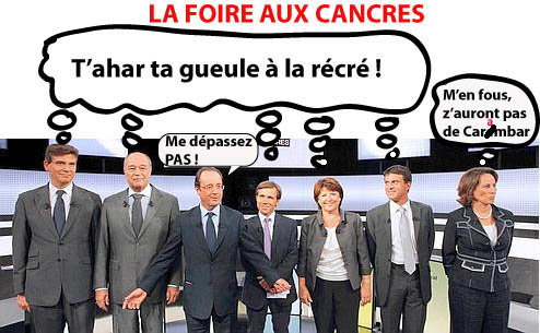 Il y a relation de cause à effet. Kévin et Jennifer consomment de la propagande socialiste comme ils consomment du jambon fumé par injection de produits chimiques. Ce n’est pas à la raison que s’adressent les charlatans de la caste bobolitique, mais bien au cerveau reptilien. Vous êtes dans la mouise ? Mais c’est pas votre faute, c’est à celle des autres, tenez, votez pour nous, nous sommes le Parti de vos envies. Et ils vont en prendre pour cinq ans, les pauvres gnaûlus ! Ah ! Ils ont beau jeu, les charlatans ! Ils occupent le devant de la scène merdiatique sans scrupule –pensez donc : les imbéciles de droite les laissent faire sans crier au scandale quand ils réquisitionnent les mairies, les listes électorales, et carrément une chaîne (que le mot est juste !) publique de tévé pour leur barnum de clowns ratés. Moi, j’appelle cela très exactement du totalitarisme, mais Kévin et Jennifer n’y voient pas mal, puisque personne ne dit rien ! Peut-être même vont-ils se piquer au jeu et choisir qui sera le candidat de la Peste que le seigneur Peuple sera appelé à choisir contre le candidat pas encore connu –mais probable- du Choléra. Participer à la mascarade, à la grande Arnaque, moyennant un pauvre uro symbolique que chacun d’eux versera dans les caisses du Parti Salafiste. Il ne leur viendrait pas même à l’idée qu’une primaire payante, c’est de l’escroquerie et que cette pratique devrait être réprimée par la loi. Puisque personne ne dit rien, hein…