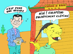 L’eurêquassion des urocrates consiste tout simplement à inciter les Chinois à investir dans le « fonds uropéen de stabilité financière » (FESF), c’est-à-dire demander au yuan.. de secourir l’uro, alors que la solution la moins stupide est de tordre le cou à cette monnaie de singe. J’appelle ça de l’acharnement thérapeutique, car il est clair que non seulement la monnaie « unique » (ah ça, oui, pour être unique, elle l’est, on n’avait pas vu ça depuis Laws!) mais aussi l’entité soft-fasciste uropéenne sont voués à crever à moyenne échéance. Bien entendu, on va chercher à maintenir artificiellement en vie tout ce système ubuesque en pressurant encore et toujours plus les peuples. Avec le risque de la révolte et de la guerre civile.
